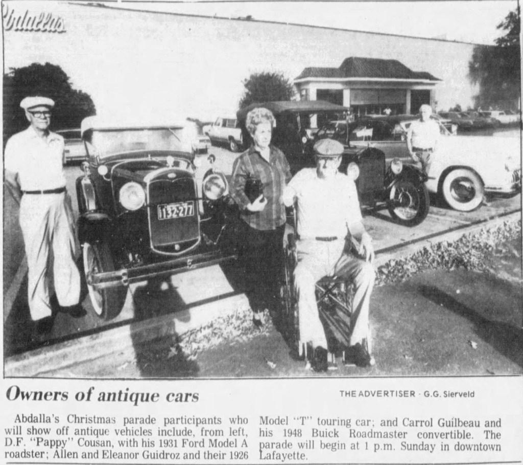 1923 Model T owned by Allen GuidrozLester Richard barbecue in early days of Louisiana AACAFrank Slovacek with his Chevy Impala – 1992Allen & Eleanor Guidroz’s 1926 Ford Model TBicentennial Parade in Lafayette – 1926 Model TEarly 60s – Allen & Eleanor Guidroz’s 1923 Model T. Allen made special hand controls to drive the car. Chapter picnic in St. Martinville Park Spring 1991Rally 1993 – Buddy Agnew (in car), John Balentine (with hammer), and Gene Hoffpauir (overalls)